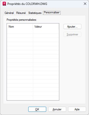 Affiche la boîte de dialogue Ajouter une propriété personnalisée, qui permet de spécifier un nom et une valeur pour la nouvelle propriété personnalisée. Le nom doit être unique. La valeur peut ne pas être renseignée.