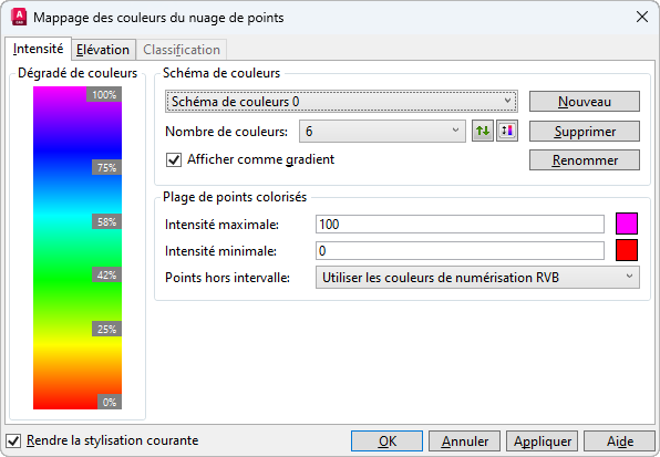 Les stylisations Intensité, Elévation et Classification appliquent une couleur au nuage de points en fonction des données de point pertinentes dans le nuage de points. Vous pouvez choisir des schémas de couleurs prédéfinis tels que "Spectre" ou "Terre", ou encore créer vos propres schémas. Vous pouvez affecter le même schéma de couleurs aux stylisations Intensité et Elévation, ou assigner un schéma différent à chacune d'entre elles. La classification possède un jeu de schémas distinct.