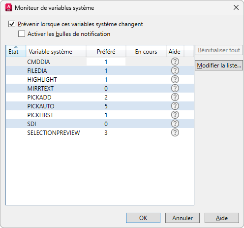 Remarque : Si vous avez modifié la valeur de la variable système avant de l'ajouter à la liste, la valeur préférée affichée sera la valeur modifiée (pas la valeur initiale).