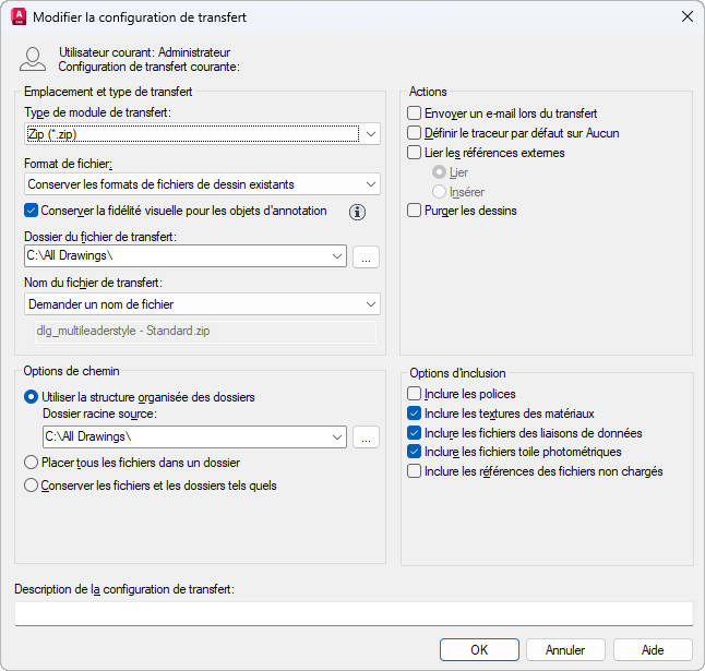 Si ce champ est laissé tel quel, le fichier de transfert est créé dans le dossier contenant le premier fichier dessin spécifié. Dans un contexte de jeu de feuilles, le fichier de transfert est créé dans le dossier contenant le fichier de données de jeu de feuilles (DST). (Non disponible pour AutoCAD LT).