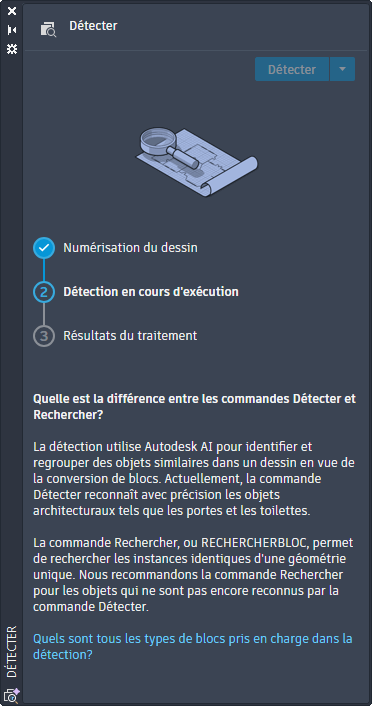 La palette Détection propose des options permettant d’analyser votre dessin et de vérifier les objets identifiés pour la conversion de blocs.
