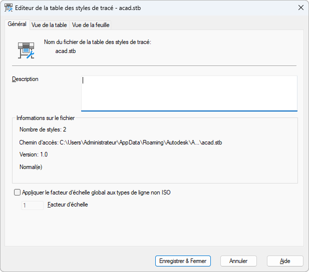 Indique le nom du fichier de la table de styles de tracé, sa description, le numéro de version, son emplacement (chemin d'accès) et son type.