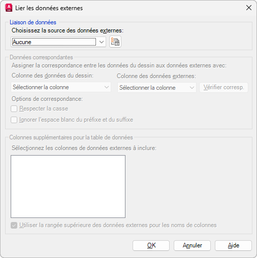 Compare les données de la colonne clé des données du dessin et celles de la colonne clé des données externes. Si les données sont uniques dans toutes les rangées des colonnes clés de données externes et s'il existe au moins une correspondance entre les données du dessin et celles de la feuille de calcul, un message affiche que la vérification de clé a réussi. Si la vérification de clé échoue, un message d'avertissement s'affiche.