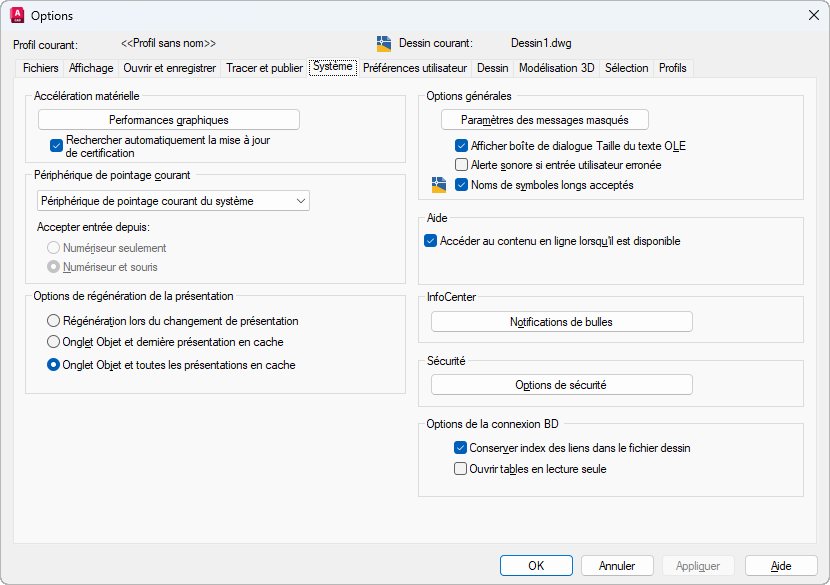 Pour chaque onglet, la liste d'affichage est mise à jour soit en régénérant le dessin, soit en sauvegardant la liste d'affichage en mémoire et en ne régénérant que les objets modifiés lorsque vous choisissez cet onglet. La modification de ces paramètres peut améliorer les performances. (variable système LAYOUTREGENCTL).