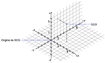 Dans l'illustration suivante, les coordonnées 3,2,5 désignent un point situé à 3 unités sur l'axe positif X, à 2 unités sur l'axe positif Y et à 5 unités sur l'axe positif Z.