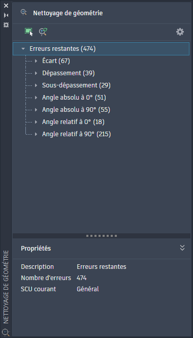 Affiche toutes les erreurs détectées du dessin ou de la sélection en cours organisées dans une arborescence. Les types d’erreur peuvent inclure l’écart, le dépassement, le sous-dépassement, l’angle absolu et l’angle relatif.