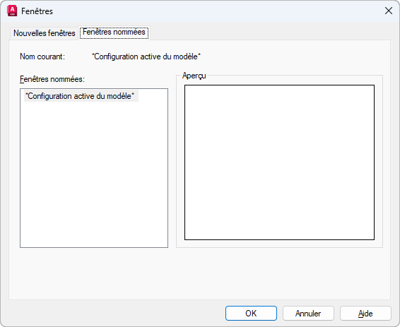 Affiche les configurations de fenêtres de l'espace objet enregistrées et nommées que vous pouvez utiliser dans la présentation courante. Vous ne pouvez ni enregistrer, ni nommer un fenêtrage de fenêtres de présentation.