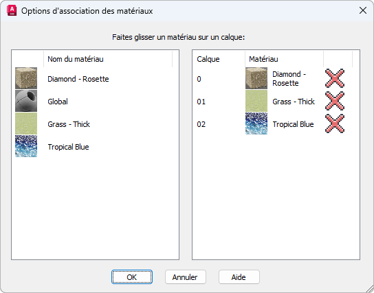 Répertorie tous les calques situés dans le dessin et dans les références externes attachées à ce dernier. La miniature du matériau affiche le matériau qui a été associé au calque. Cliquez sur le bouton Détacher (en forme de X) pour supprimer le matériau du calque.