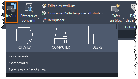 | Galerie du ruban - Dans l’onglet Accueil, panneau Blocs, vous pouvez cliquer sur Insérer pour afficher une galerie de définitions de bloc dans le dessin courant. Utilisez la galerie lorsque vous devez insérer rapidement peu de blocs (en cliquant dessus et en les plaçant dans le dessin).