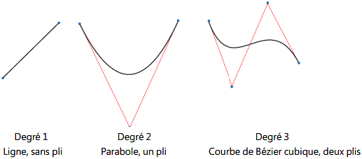 Une courbe dont le degré est défini sur 1 est une ligne droite ; une courbe dont le degré est défini sur 2 présente un coude. Le degré d'une courbe de Bézier est défini sur 3. Les degrés plus élevés créent des courbes plus complexes, mais nécessitent des calculs.