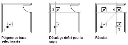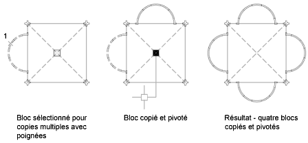 Vous pouvez, par exemple, utiliser l'option Copier pour faire pivoter les objets sélectionnés et en placer des copies à chaque emplacement que vous spécifiez à l'aide du périphérique de pointage.
