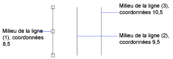 Si vous maintenez la touche CTRL enfoncée lors de la sélection de points de copie multiple, le curseur graphique se place automatiquement sur un point décalé en fonction des deux derniers points sélectionnés. Dans l'illustration ci-dessous, le milieu de la ligne 1 se situe à la coordonnée 8,5. En fonction de ce milieu, la ligne 2 a été copiée à l'aide de la touche CTRL et au mode d'accrochage Etirer. Son milieu se situe à 9,5. La troisième ligne se place automatiquement sur un point décalé en fonction des valeurs de coordonnées 10,5.