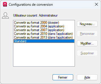 Affiche la boîte de dialogue Modifier la configuration de la conversion, qui vous permet de spécifier des options pour la conversion des dessins sélectionnés.
