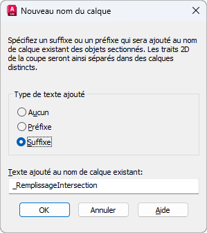 Par défaut, toute la géométrie de bloc de coupe est placée sur le calque 0 (zéro). Toutefois, vous pouvez spécifier des suffixes ou préfixes pour vous aider à organiser les composants de blocs de coupes, tels que le remplissage et les contours d'intersections. Lorsque vous insérez le bloc de coupe, ses composants sont placés sur de nouveaux calques dont les noms associent le nom du calque contenant l'objet coupé et le préfixe ou suffixe spécifié. Si le plan de coupe inclut des objets figurant sur plus d'un calque, plusieurs nouveaux calques d'objet sont créés.