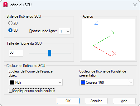 Spécifie l'affichage de l'icône SCU en 2D ou 3D, ainsi que son aspect.