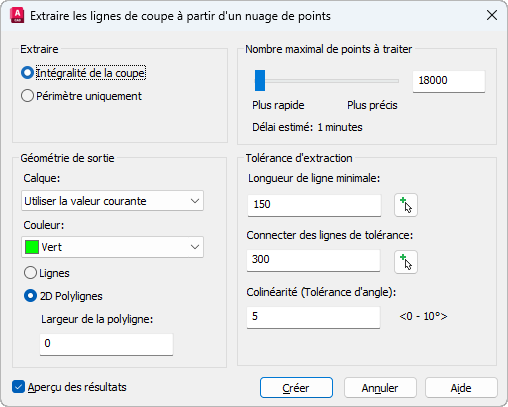 Boîte de dialogue Extraire des lignes de coupe d'un nuage de points