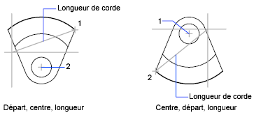 La distance séparant le point de départ et le centre détermine le rayon. L'autre extrémité de l'arc est déterminée en spécifiant la longueur de corde entre le point de départ et l'extrémité de l'arc.