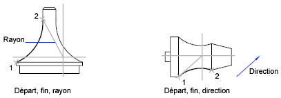 La direction de la voûte de l'arc est déterminée par l'ordre dans lequel vous spécifiez ses extrémités. Vous pouvez spécifier le rayon en le saisissant directement ou en désignant un point à la distance correspondant au rayon voulu.