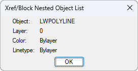 Lorsque vous sélectionnez l'objet, la boîte de dialogue Xref/Block Nested Object List s'ouvre et contient les informations de propriétés suivantes :