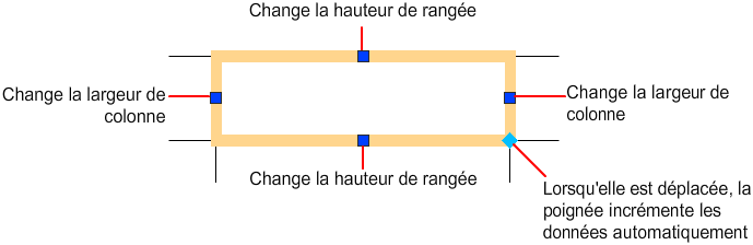 Il suffit de cliquer dans une cellule pour la sélectionner. Les poignées apparaissent au milieu des bordures de la cellule. Cliquez à l'intérieur d'une autre cellule pour déplacer la cellule sélectionnée vers cette cellule. Faites glisser les poignées d'une cellule pour élargir ou réduire la cellule et sa colonne ou rangée.