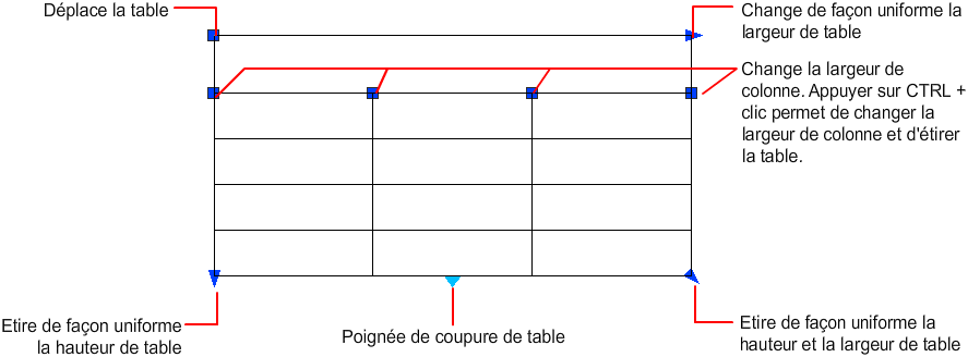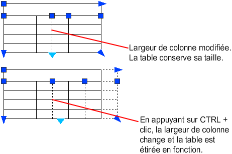 Lorsque vous changez la hauteur ou la largeur du tableau, seule la ligne ou la colonne adjacente à la poignée sélectionnée change. Le tableau conserve sa hauteur ou sa largeur. Pour modifier la taille du tableau proportionnellement à la taille de la rangée ou de la colonne que vous modifiez, appuyez sur la touche Ctrl tout en déplaçant la poignée d'une colonne.