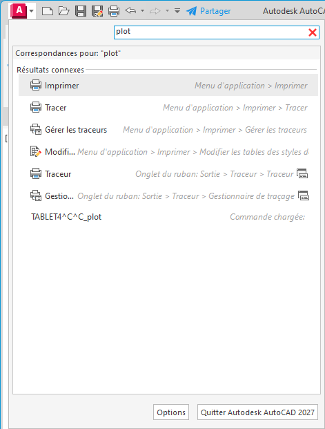 Le champ de recherche de commande s'affiche en haut du menu de l'application. Les résultats de la recherche peuvent inclure des commandes de menu, des info-bulles de base et des chaînes de texte d'invite de commande. Vous pouvez entrer un terme à rechercher dans n'importe quelle langue. Les résultats s'appliquent à l'espace de travail courant.