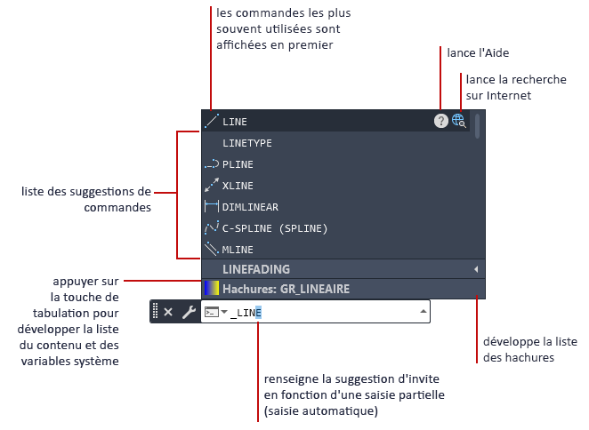 Une liste des commandes suggérées s'affiche dès que vous entrez les premières lettres d'une commande dans la fenêtre de commande ou dans la zone de saisie dynamique. Par défaut, la liste présente les caractéristiques suivantes :