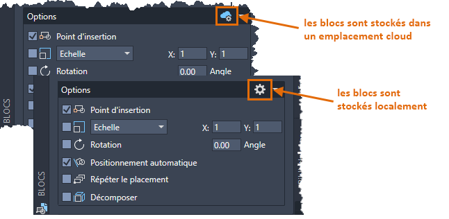 Remarque : Le bouton Paramètres de synchronisation des blocs situé dans la partie inférieure de la palette Blocs est dynamique et varie en fonction de l'emplacement courant de vos blocs récents et favoris.
