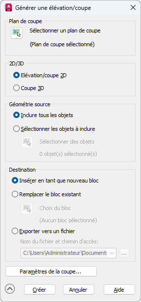 Boîte de dialogue Génération d'une élévation/coupe