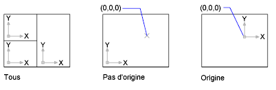 Affiche l'icône à l'origine (0,0,0) du SCU courant. Si l'origine se trouve en dehors de la vue, elle est affichée dans le coin inférieur gauche de la fenêtre de présentation.