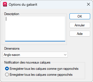 La boîte de dialogue Options du gabarit s'affiche automatiquement après avoir indiqué *.dwt comme type de fichier. Entrez le nom de fichier du gabarit, puis cliquez sur Enregistrer.
