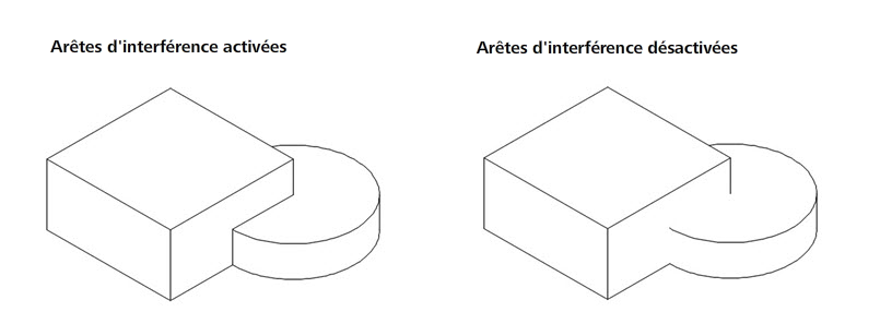 Active ou désactive la visibilité des arêtes d'interférence. Les arêtes d'interférence apparaissent lorsque des corps solides se coupent. Lorsque la visibilité des arêtes d'interférence est activée, le programme trace une ligne à l'intersection des corps solides.