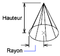 Spécifie l'emplacement de l'extrémité de l'axe du cône. L'extrémité de l'axe correspond au point supérieur du cône ou au point central de la face supérieure du tronc de cône (option Rayon supérieur). L'extrémité de l'axe peut se trouver n'importe où dans l'espace 3D. Elle définit la longueur et l'orientation du cône.
