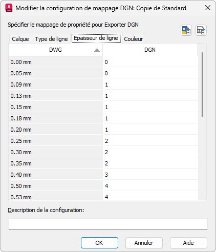Un jeu prédéfini d'épaisseurs de ligne est affiché. Celui-ci indique la meilleure correspondance entre les épaisseurs de ligne utilisées dans les fichiers DGN et DWG. Vous pouvez copier et coller une ou plusieurs épaisseurs de ligne à l'aide du menu contextuel (clic droit) de la colonne de droite. Vous ne pouvez modifier que la colonne de droite de l'onglet Epaisseur de ligne. La colonne de gauche n'est pas modifiable.