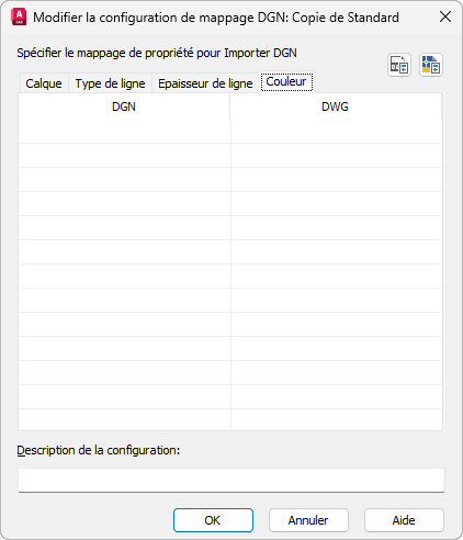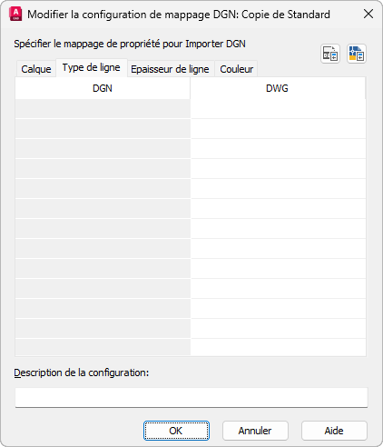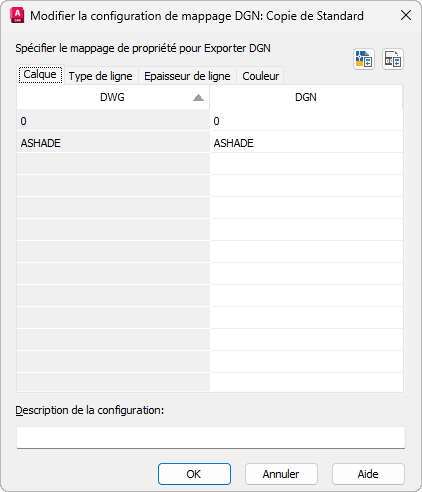 Configuration de mappage existante : si vous êtes en train de modifier une configuration de mappage (même si vous modifiez une configuration autre que Standard à partir de la boîte de dialogue Importer (ou Exporter) les paramètres DGN), les propriétés affichées dans la table de mappage ne sont pas dérivées du fichier DGN importé ou du fichier dessin exporté.