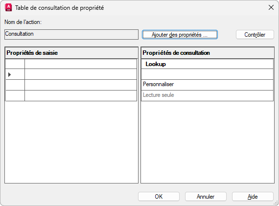 Affiche la valeur personnalisée affectée aux propriétés de saisie. Cliquez sur le bas d'une colonne de consultation pour mettre la propriété de consultation en lecture seule ou autoriser la consultation inversée. L'option Autoriser la consultation inversée active une liste déroulante associée à la poignée de consultation qui modifie la référence de bloc d'après les valeurs de propriétés de saisie dans la table.