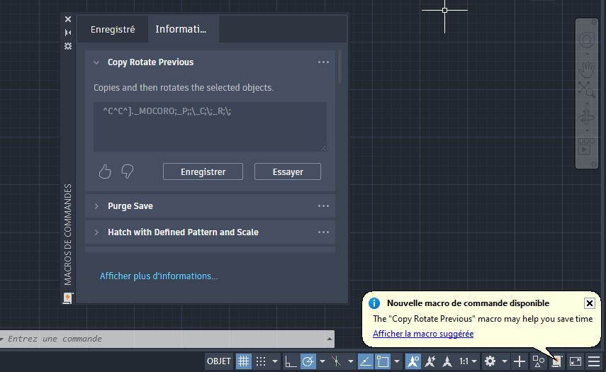 Ces informations sont créées et vous sont fournies dans le produit selon la fréquence à laquelle vous utilisez des séquences de commandes spécifiques. Par exemple, si vous deviez copier des objets à l'aide de la commande COPIER, puis utiliser la commande ROTATION pour faire pivoter les objets, vous auriez utilisé une séquence de commandes COPIER, ROTATION. Lorsque vous utilisez des commandes dans le produit, vos séquences de commandes sont évaluées pour déterminer si elles peuvent être associées à une macro de commandes recommandée.