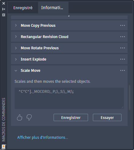 La palette Macros de commandes affiche les recommandations de macros de commandes précédemment enregistrées et les nouvelles recommandations identifiées en fonction des séquences de commandes exécutées dans le produit.