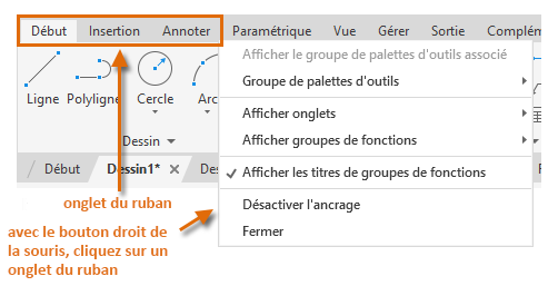 - Cliquez sur la barre de titre, puis faites glisser le ruban sur le bord gauche, droit ou supérieur de la zone de dessin
