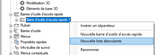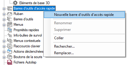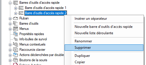 Une nouvelle barre d'outils d'accès rapide (appelée Barre d'outils d'accès rapide1) est placée en bas du noeud Barres d'outils d'accès rapide.