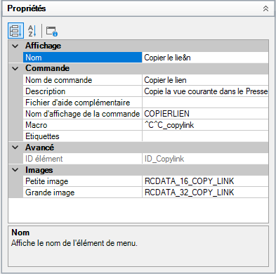 L'exemple suivant désactive l'élément de menu Copier le lien en ajoutant un tilde (~) devant la valeur de la propriété Nom.
