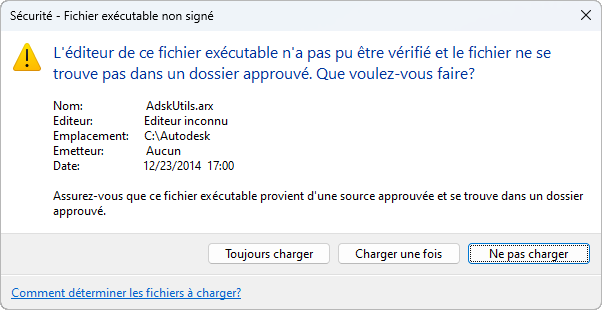 Lorsque vous chargez un fichier programme signé numériquement, le programme basé sur AutoCAD ou AutoCAD LT en vérifie la signature numérique. Selon que la signature numérique a pu être vérifiée ou non, un message autorisant ou refusant le chargement du fichier dans l'environnement de dessin apparaît.