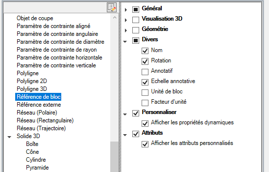 Contrôle de l'affichage des propriétés personnalisées et des attributs pour les références de bloc