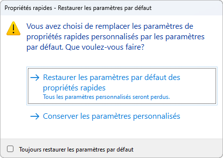 - Cliquez sur Restaurer les paramètres par défaut des propriétés rapides.