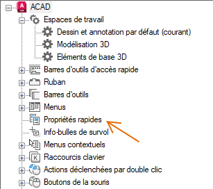 - Dans le volet Personnalisations dans <nom de fichier> de l'onglet Personnaliser, cliquez avec le bouton droit de la souris sur Propriétés rapides.