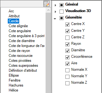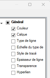 - Dans le volet Propriétés, activez les cases à cocher en regard des propriétés générales que vous voulez afficher dans la palette Propriétés rapides pour tous les types d'objet.