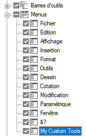 - Dans le volet Personnalisations dans <nom de fichier>, cliquez sur le signe Plus (+) en regard du noeud Menus pour le développer.