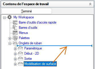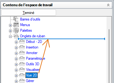 - Dans le volet Contenu de l'espace de travail, cliquez sur le signe plus (+) en regard du nœud Onglets de ruban pour le développer.