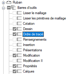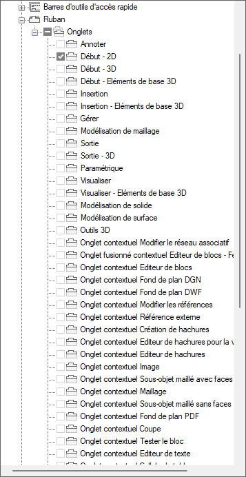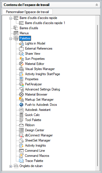 Utilisez l'éditeur Personnaliser l'interface utilisateur pour contrôler l'affichage de la barre d'outils d'accès rapide, des groupes de fonctions et des onglets du ruban, des palettes d'outils, des barres d'outils et des menus déroulants.