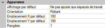 - Entrez un nombre dans la zone Emplacement Y par défaut. Indiquez la valeur 0 pour placer la barre d'outils dans la partie supérieure de l'écran. Plus le chiffre est élevé, plus la barre d'outils est placée en haut. (Disponible uniquement si l'option Orientation est définie sur Flottant.)